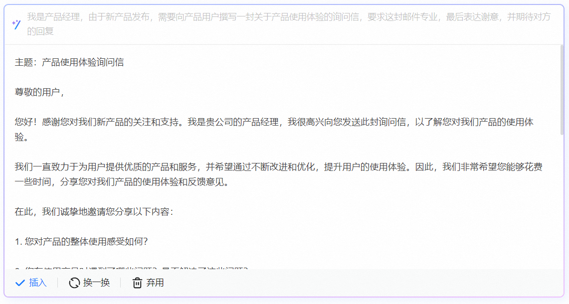 启用功能后,在写信页可以唤起AI助手帮助你撰写新邮件、回复邮件以及润色邮件。