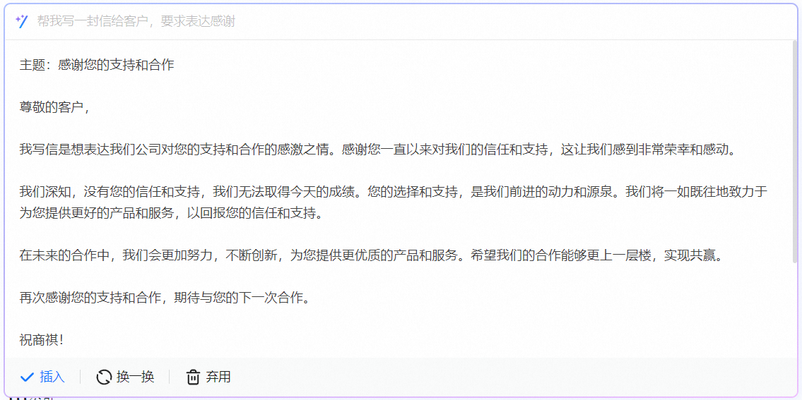AI智能写信是智能化的企业邮箱写信功能,它利用自然语言处理技术,在撰写邮件正文时,可以为你提供一些写作建议。它能够生成某些常见场景的邮件,如询问信、感谢信等,也可以自定义需求,生成邮件内容。